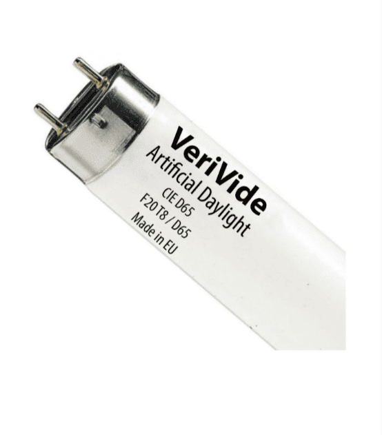 Bóng đèn so màu D65 Verivide F20T8/D65 Sản xuất tại EU, Đây là loại bóng được sử dụng rộng rãi trong việc so màu trong nhiều lĩnh vực khác nhau: bao bì, may mặc, dệt nhuộm, mực in. công dụng của chúng là để tạo điều kiện ánh sáng ban ngày theo tiêu chuẩn quốc tế ISO 23603-CIE 012/E khi thực hiện công việc so màu
